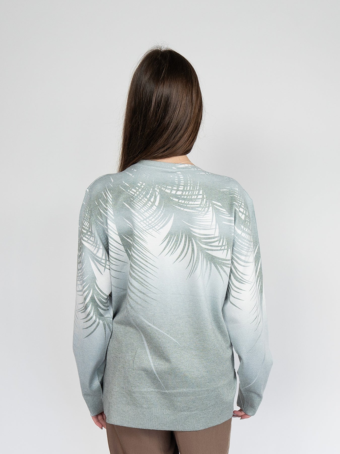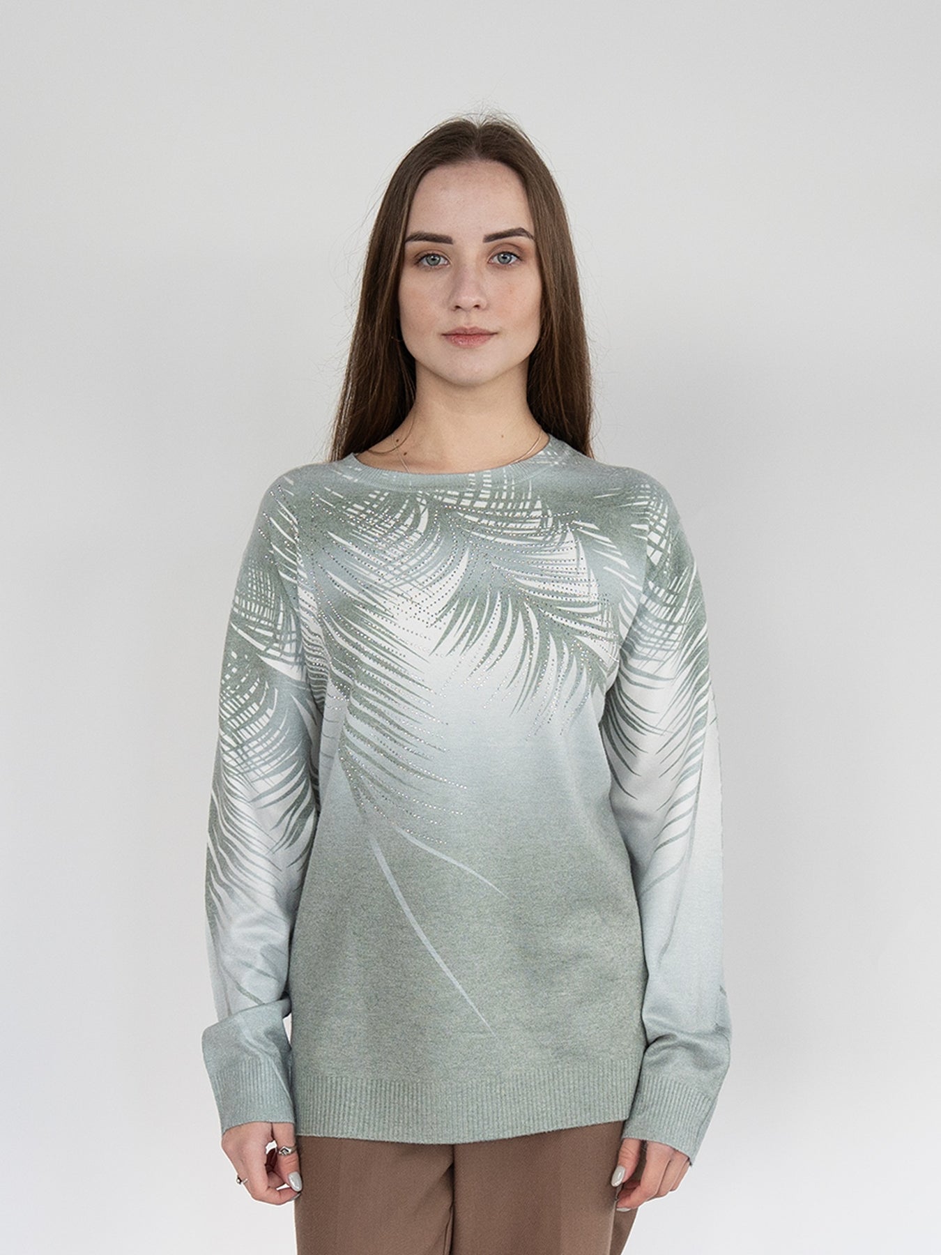 Women Sweater in Green Print , Crew Neck Long Sleeve and decorated with hot -fix rhinestones