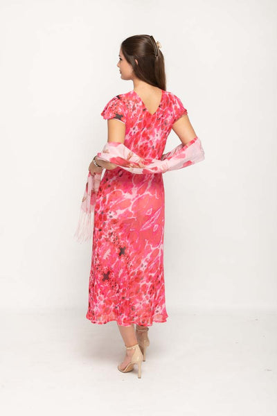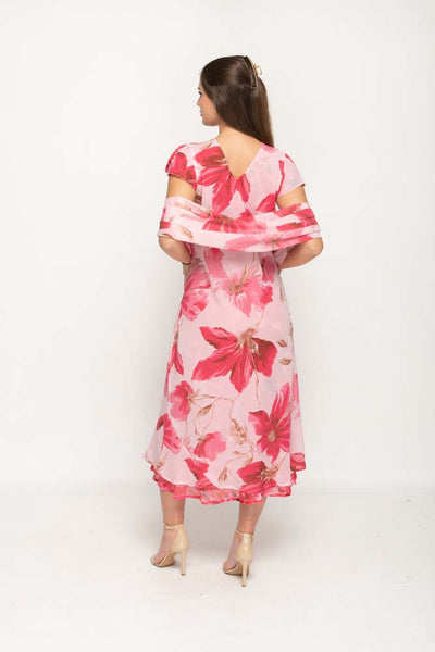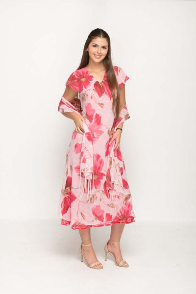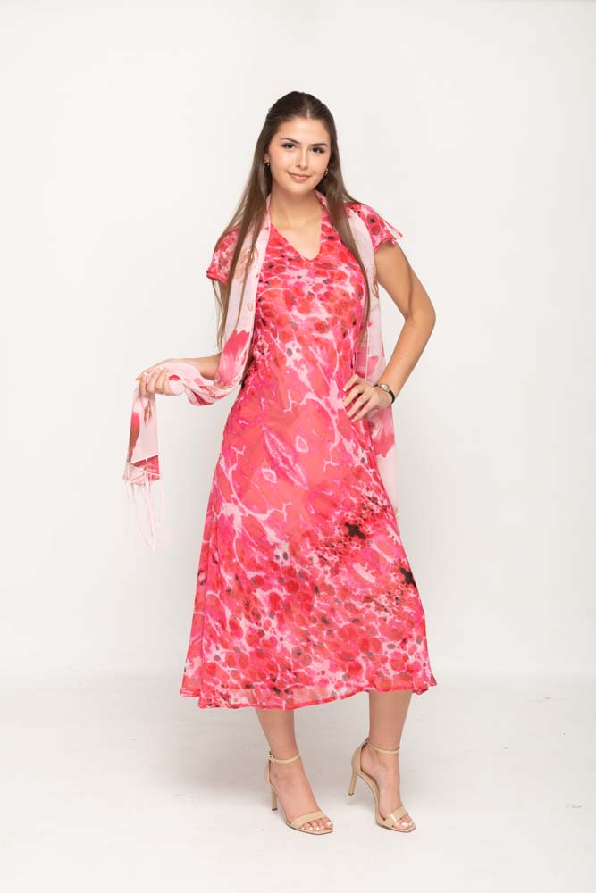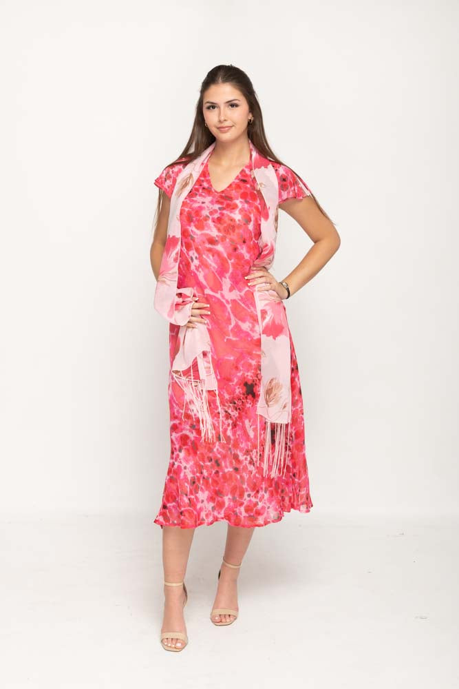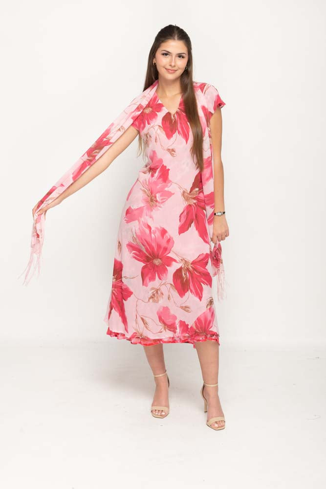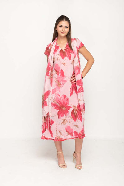 Introducing our Pink Floral Printed Reversible Long Dress with Scarf, a bold and fashionable addition to your wardrobe. Crafted from 100% Poly Georgette, this dress offers both comfort and a trendy look and the set includes a matching scarf for added flair.