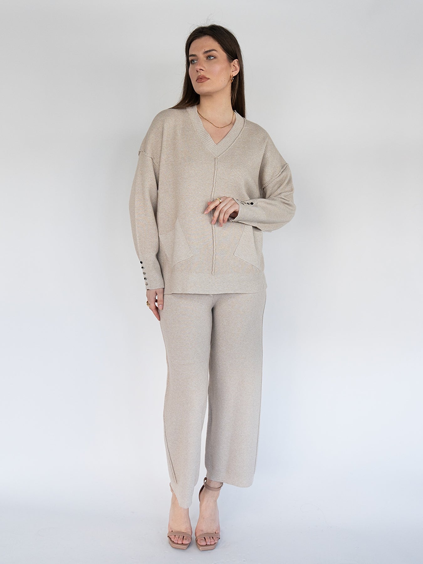 Women Knit Casual Wide Leg Pants Set in Heathered Beige with Silver Thread, V- Neck Sweater with Two Patch Pockets and Knit Wide Pants, High Elastic Waist with Drawstring