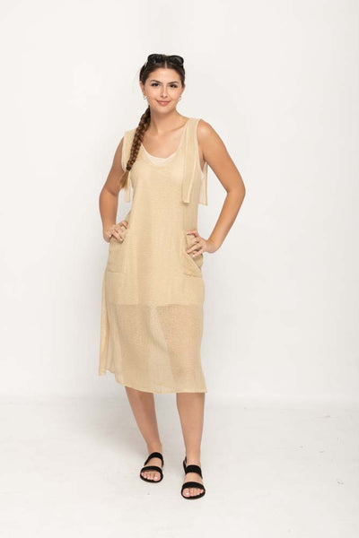 Women 's Casual Dress  in Beige Color, Deep V- Neck , Sleeveless with two Patch Pockets, ,Ribbon sewn on shoulders .  Uniquely Burlap Cotton Fabric
