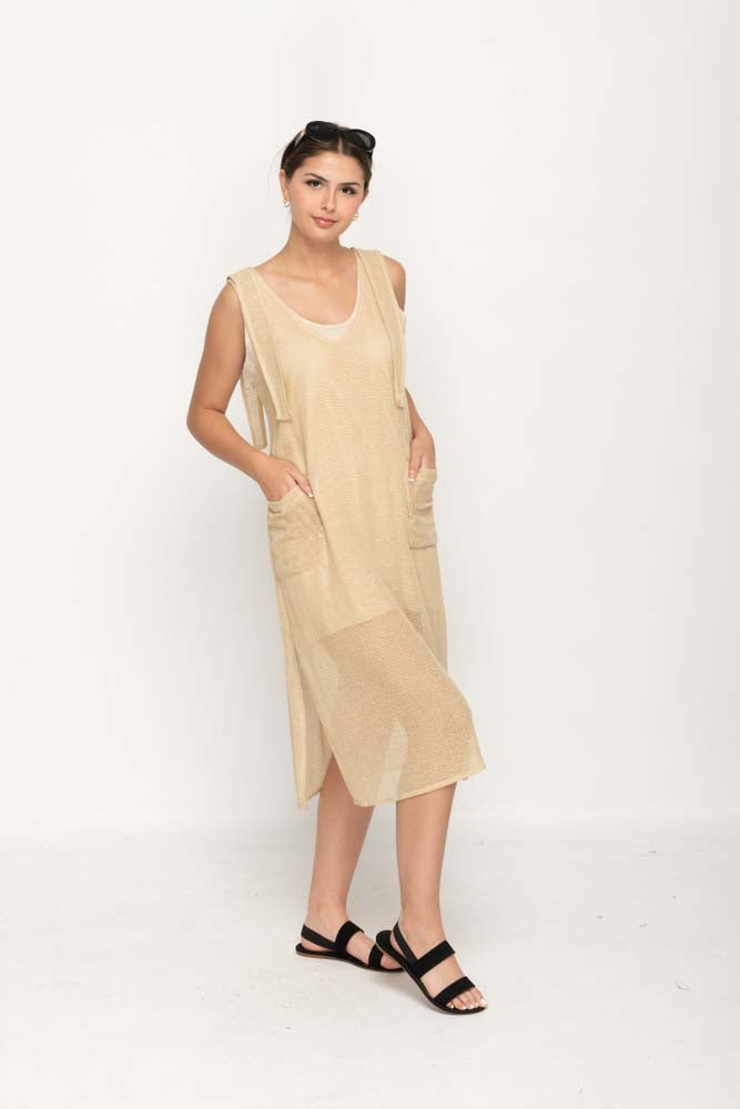 Women 's Casual Dress in Wheat , Deep V- Neck , Sleeveless with two Patch Pockets,