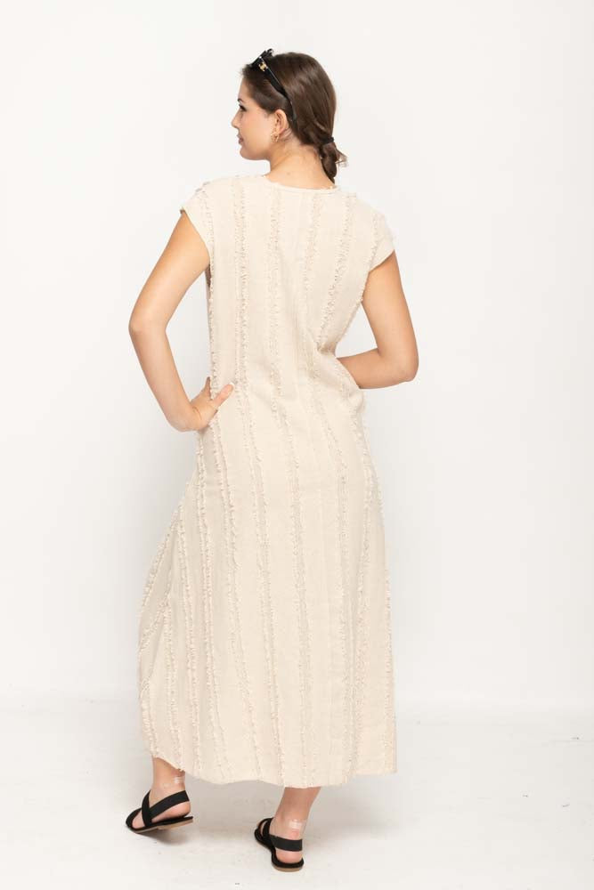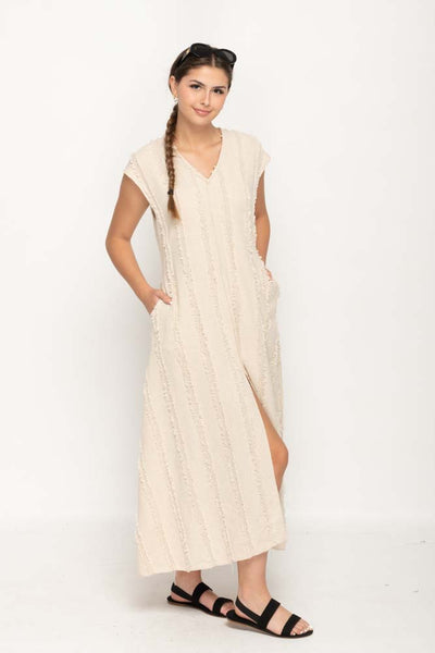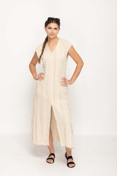 Women 's Casual Dress  in Beige Color, Loose style V- Neck , Cap Sleeves with Front Slit, Uniquely Cotton Fabric