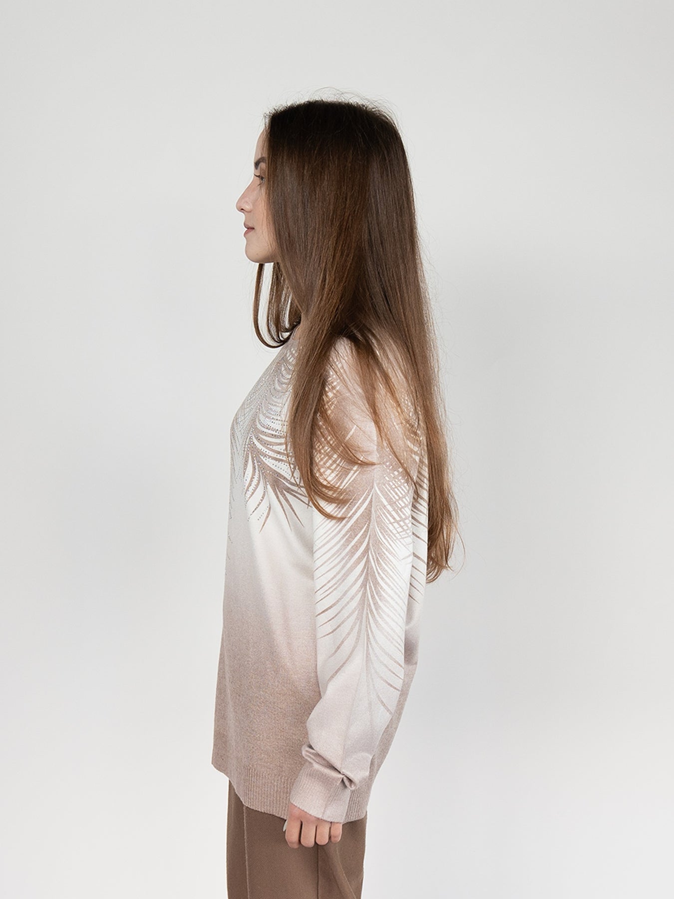 Women Sweater in Brown Print , Crew Neck Long Sleeve and decorated with hot -fix rhinestones