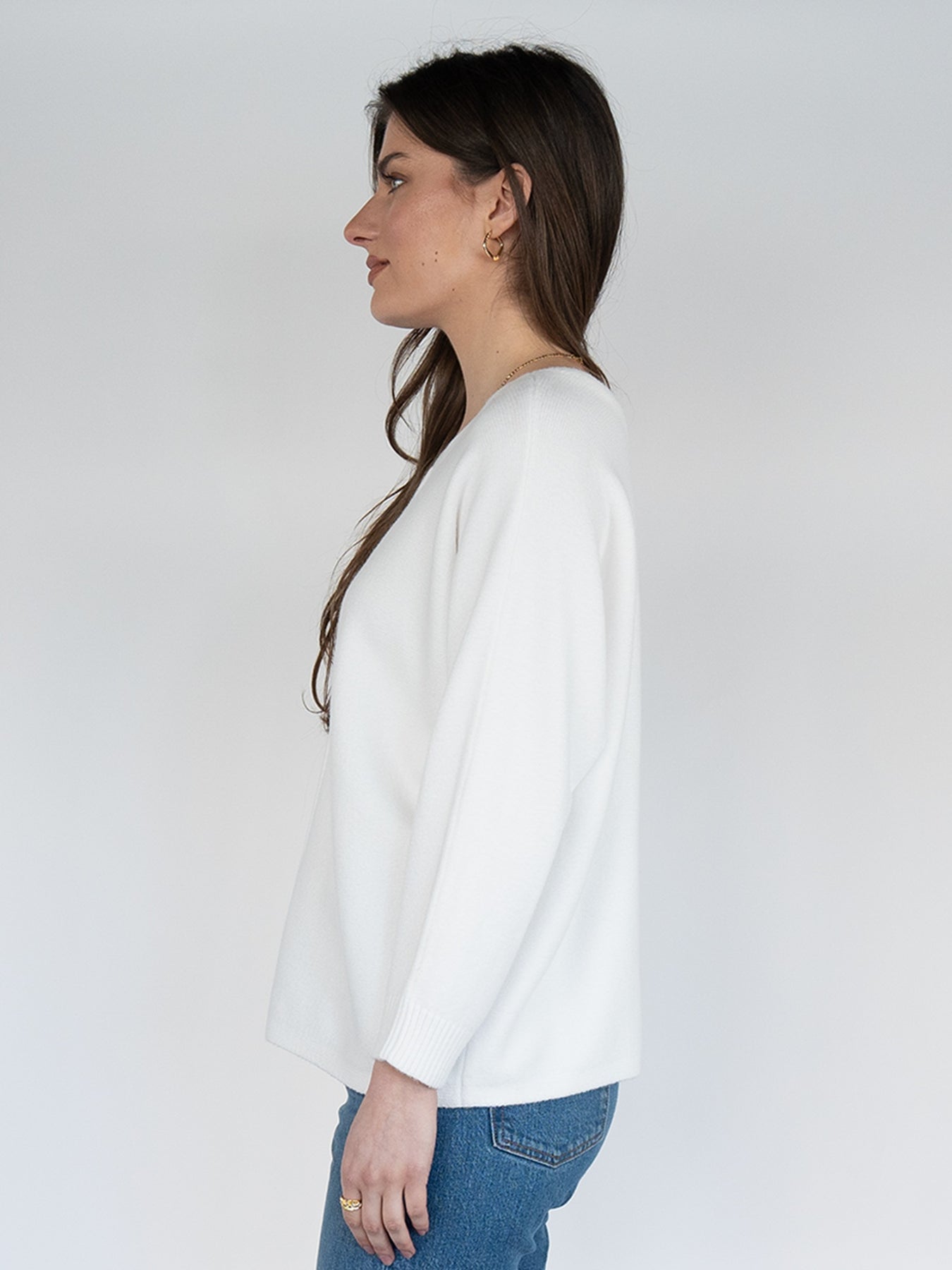 Women Sweater in white , Crew Neck , A rhinestone trim on middle of front.