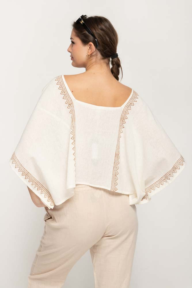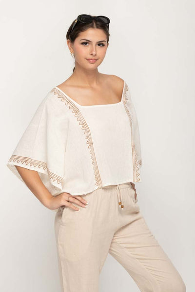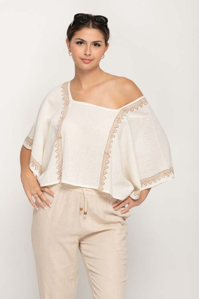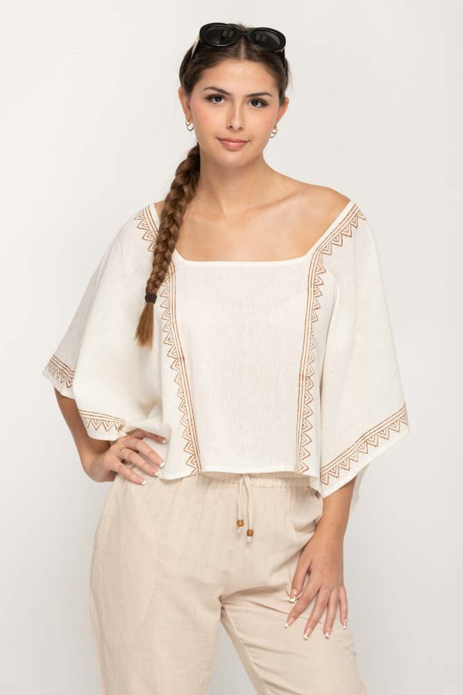 Women's Oversize Top in Cream With Square Neck, Baggy Style , with decorative prints along front back and cuffs.