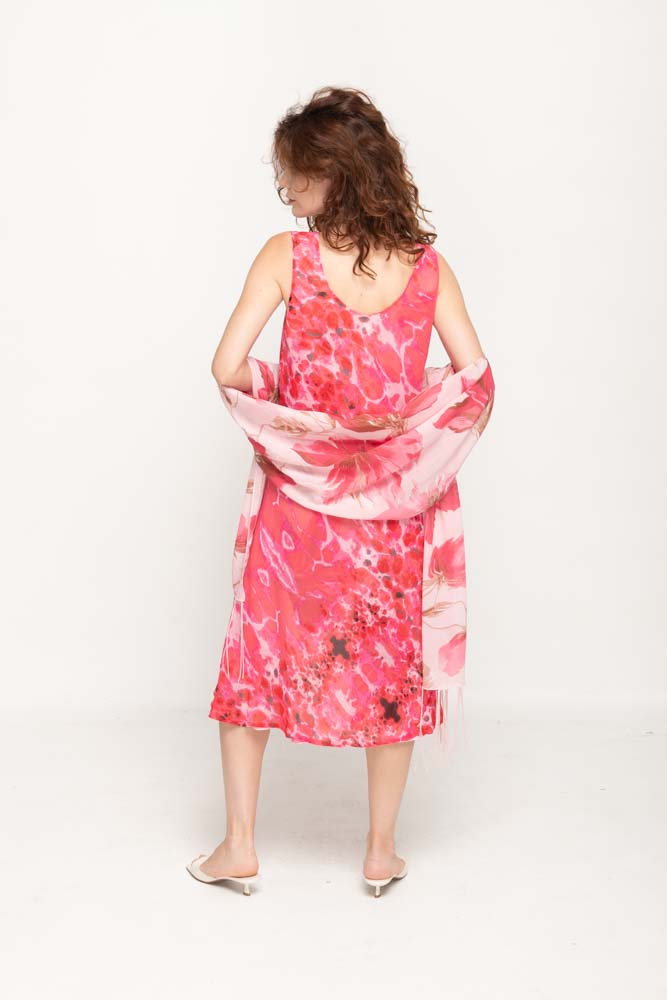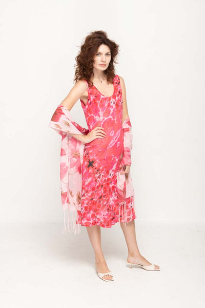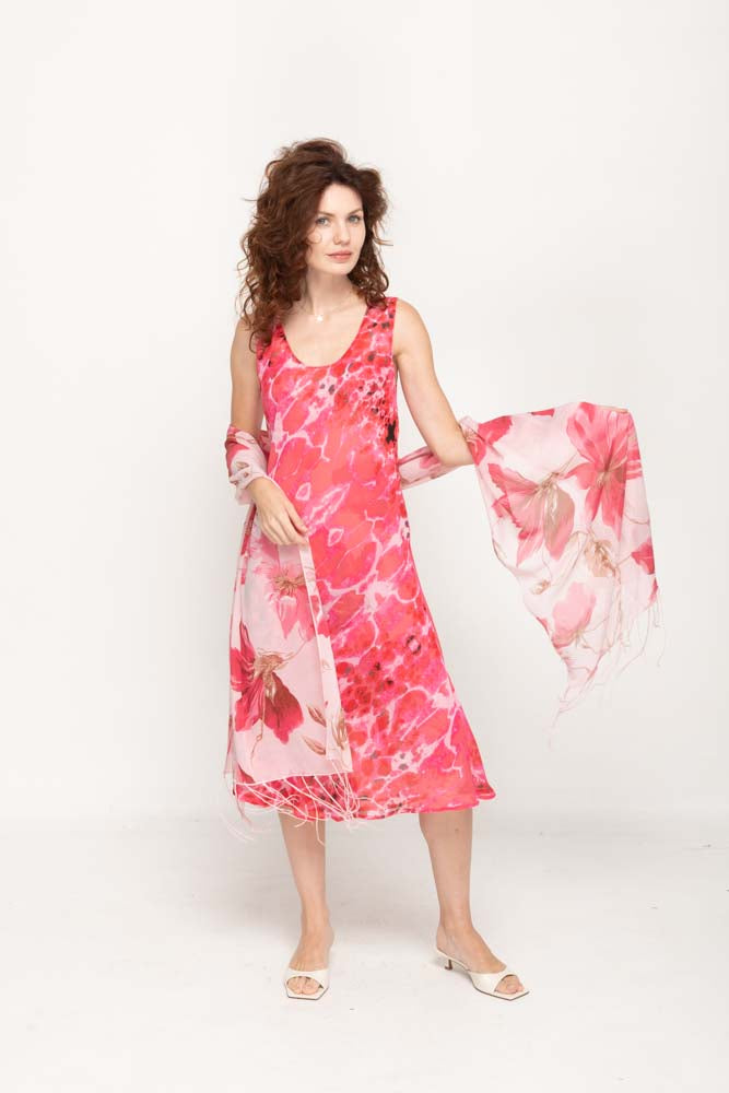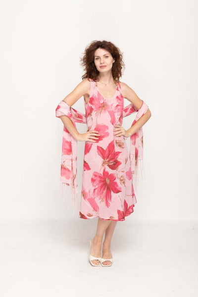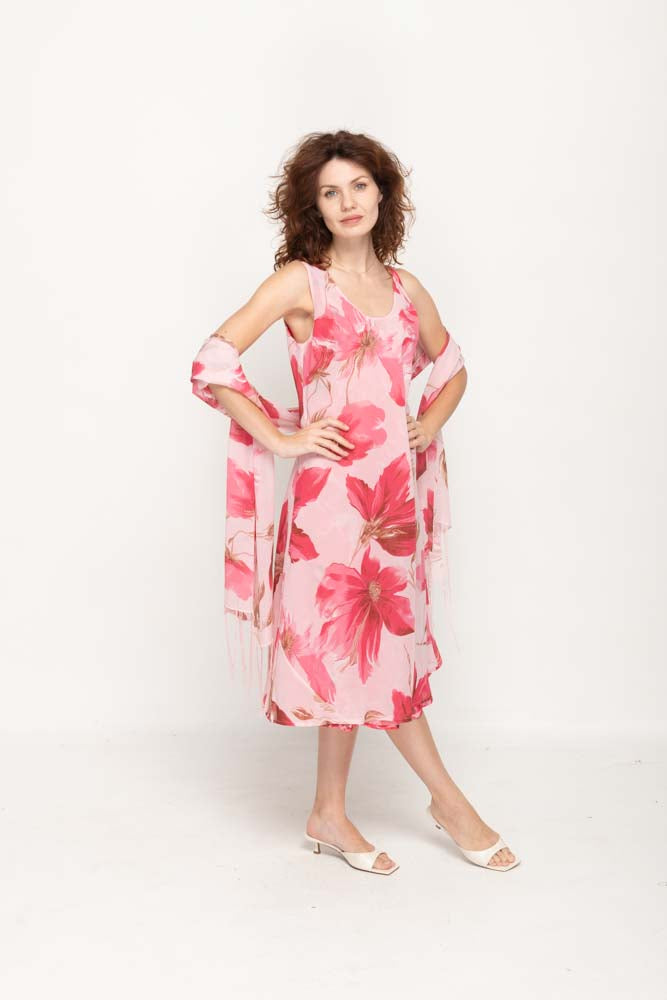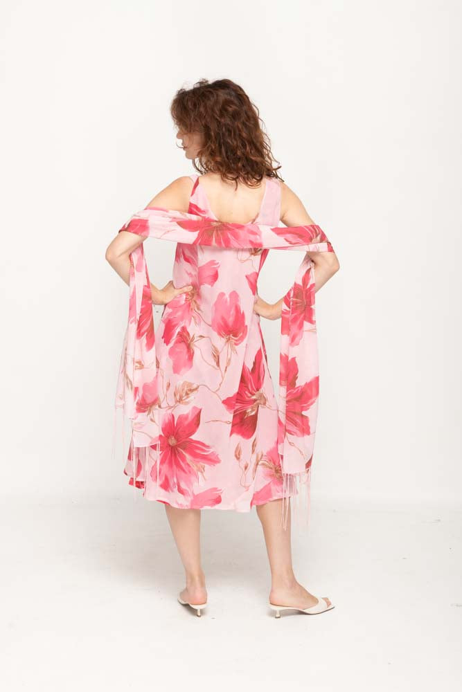 Introducing our Pink floral Printed Reversible Short Midi Dress with Scarf, a chic and versatile addition to your wardrobe. Crafted from 100% Poly Georgette, this dress offers both comfort and a trendy look. The floral print adds a touch of elegance and charm to your ensemble, and the set includes a matching scarf for added style.