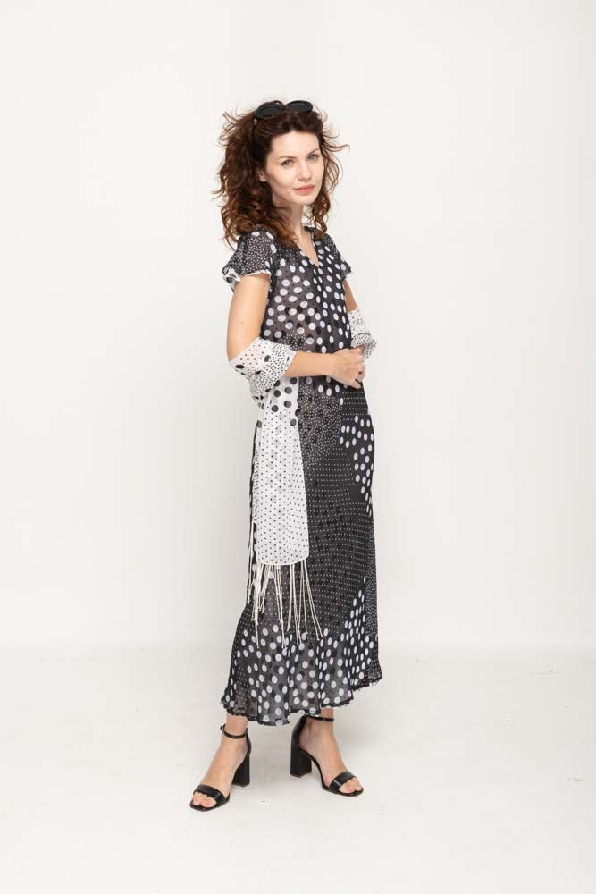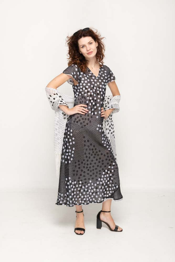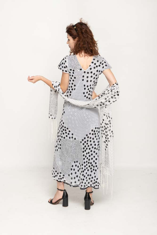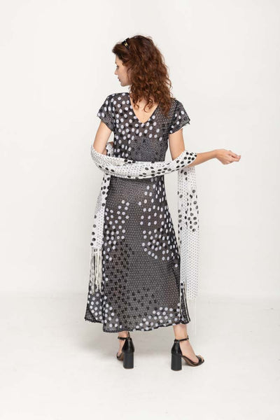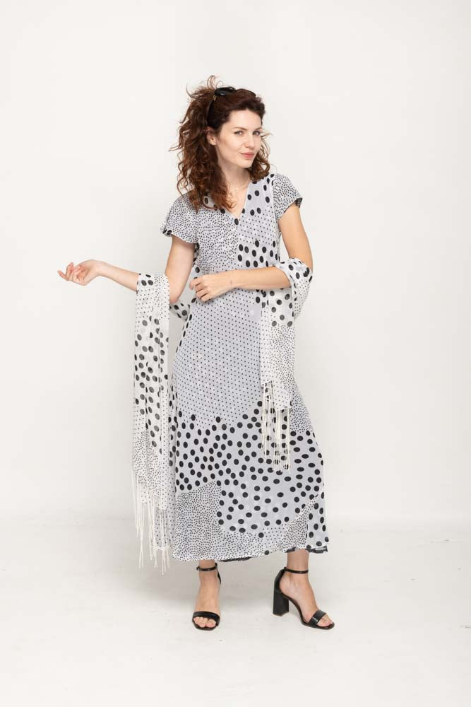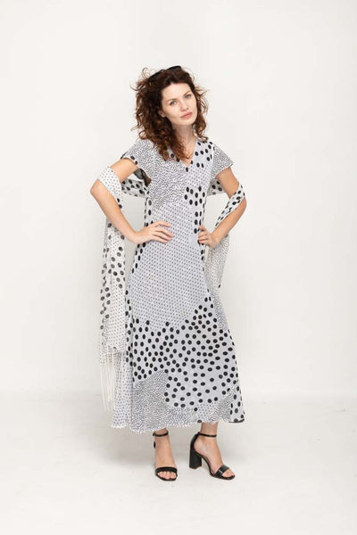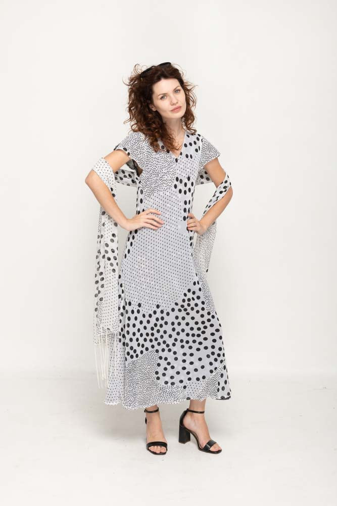 Introducing our Dot Printed Black and White Reversible Long Dress with Scarf, a chic and versatile addition to your wardrobe. Crafted from 100% Poly Georgette, this dress offers both comfort and a trendy look. The dot print adds a touch of elegance and charm to your ensemble, and the set includes a matching scarf for added style.