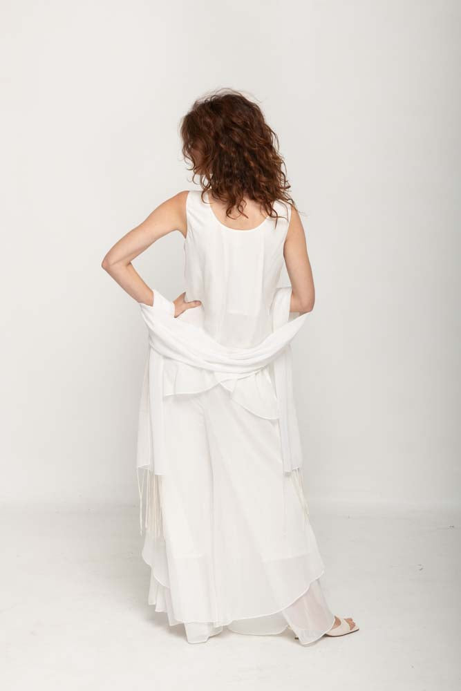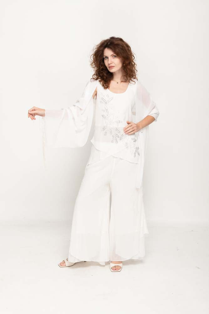 Introducing our white Pant Set with Scarf, a stylish and versatile addition to your wardrobe. Crafted from 100% Poly Georgette, this set offers both comfort and a trendy look. The white with silver decorating sequins adds a touch of elegance and charm to your ensemble, and the set includes a matching scarf for added style.