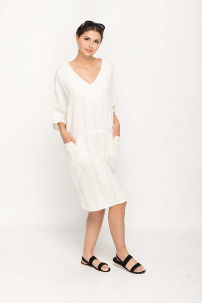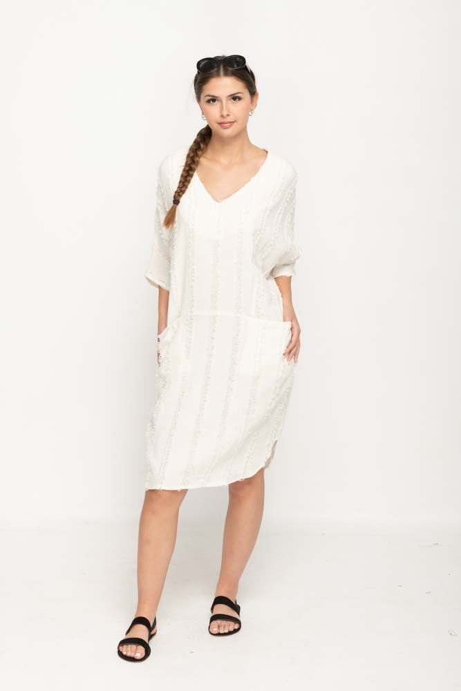 Women 's Casual Dress in Cream Color, Loose style V- Neck two pockets on Front, Uniquely Cotton Fabric