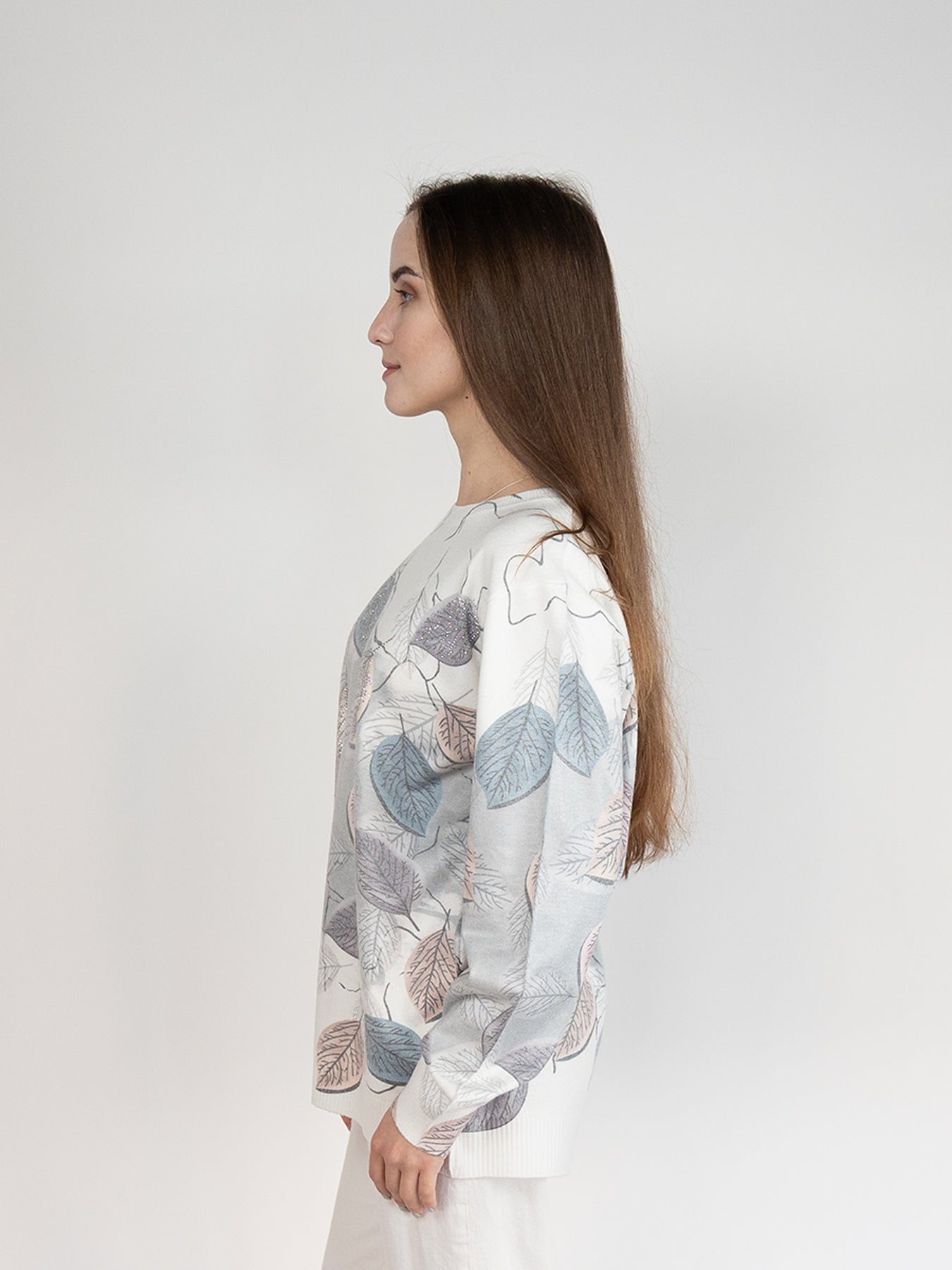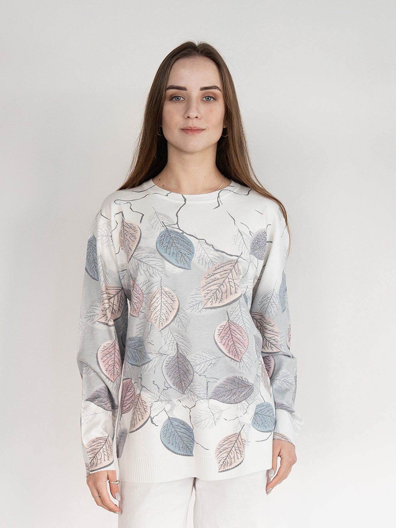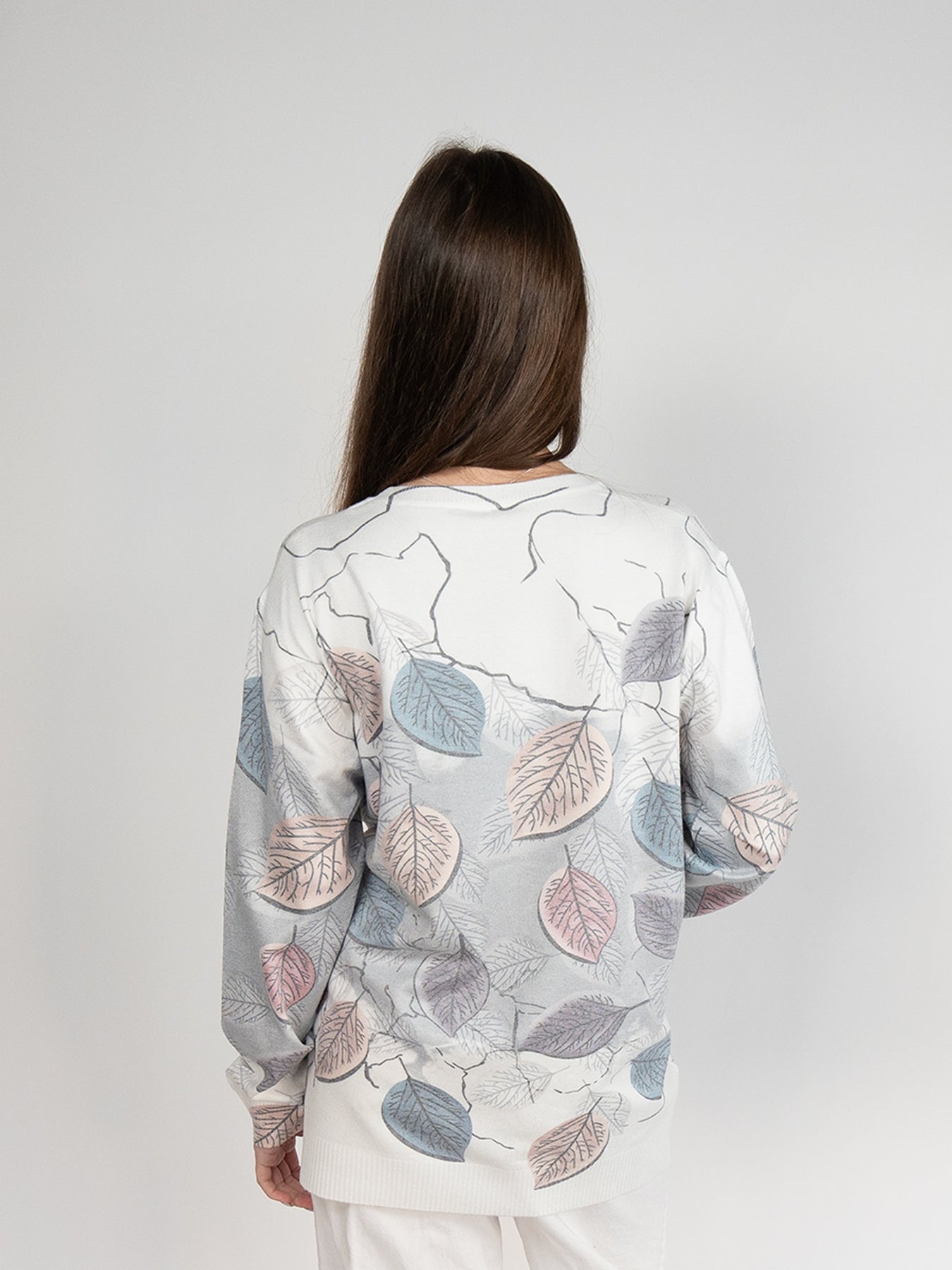 Women sweater in cream with leaves print , crew Neck long sleeve and decorated with hot -fix rhinestones