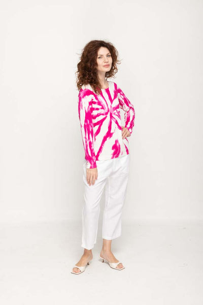 Introducing our Women's Fuchsia Tie -Dye Prints Full Sleeve , Crew Neck Knit Top , a versatile and stylish addition to your wardrobe. Crafted from a blend of polyester and viscose, this knitted top offers both comfort and a trendy look. The Fuchsia Tie -Dye Prints design adds vibrancy and flair to your ensemble.